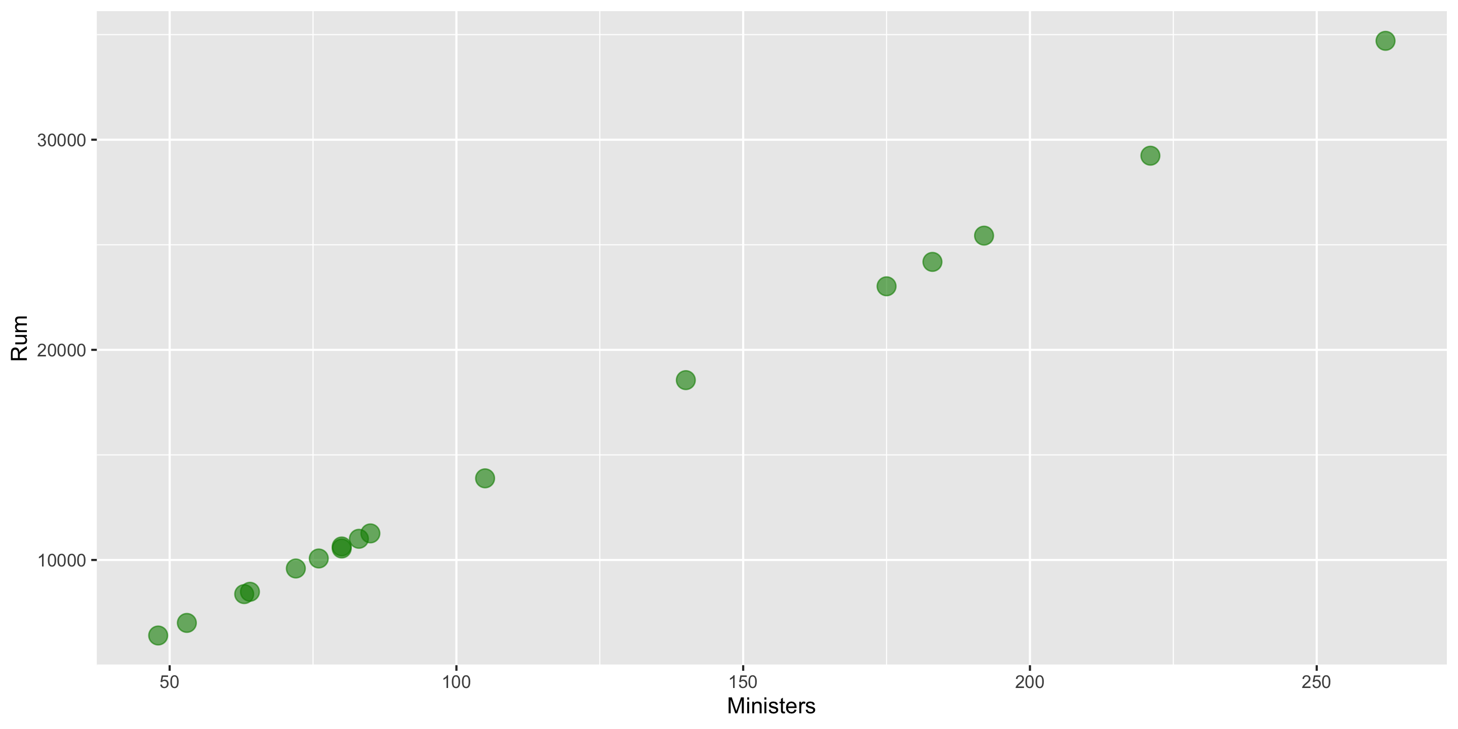 We have data on the number of Methodist ministers in New England and the number of barrels of rum imported into Boston each year. The data range from 1860 to 1940.