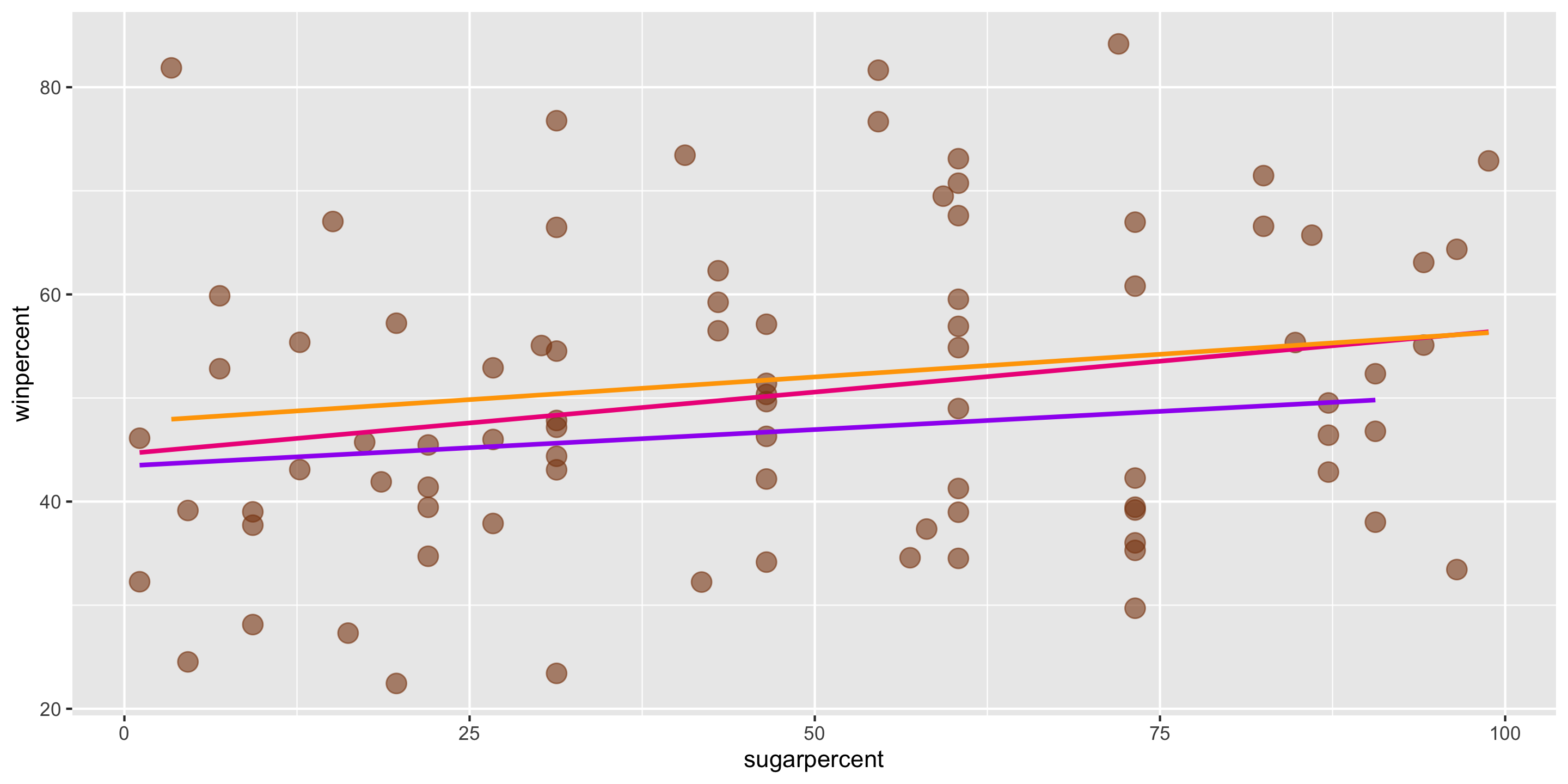 sugarpercent = 73. What does the model predict for winpercent?\[ \widehat{y} = \widehat{\beta}_0 + \widehat{\beta}_1 x \] In this case, \(\widehat{\beta}_0 = 44.6094\) and \(\widehat{\beta}_1 = 0.1192\).