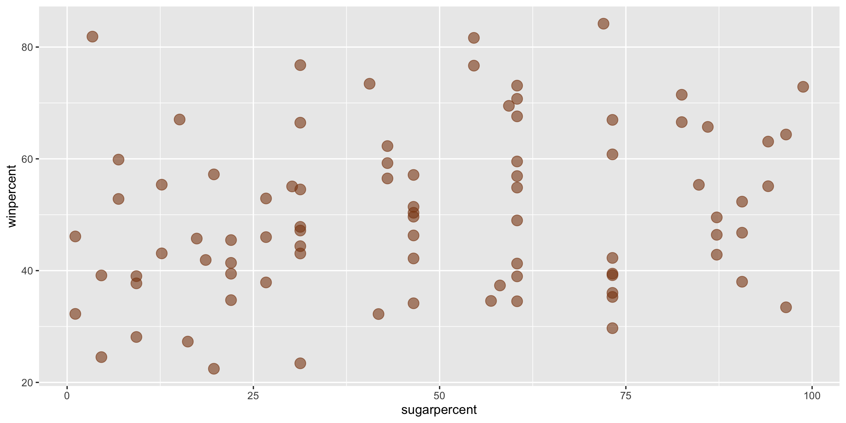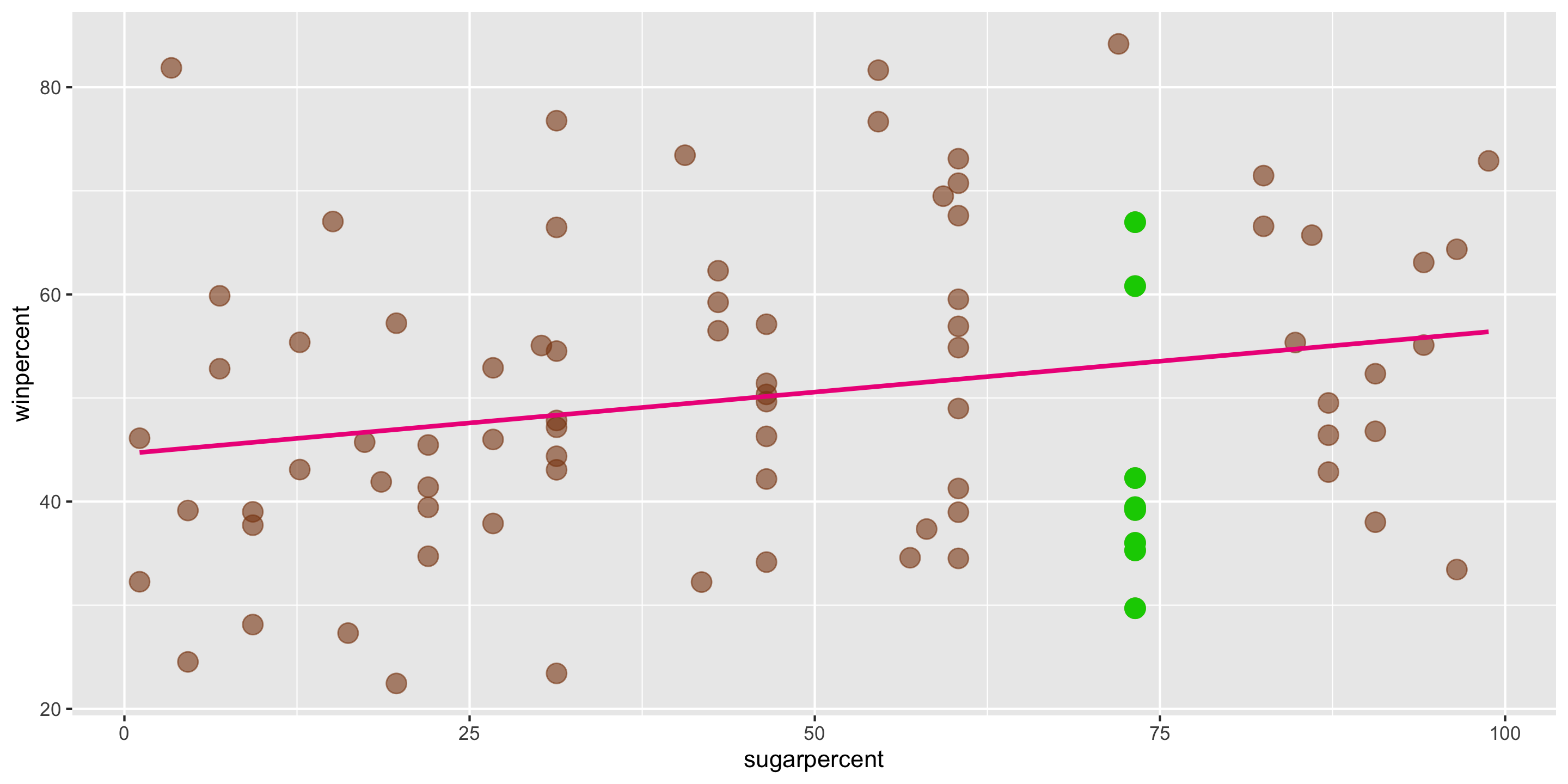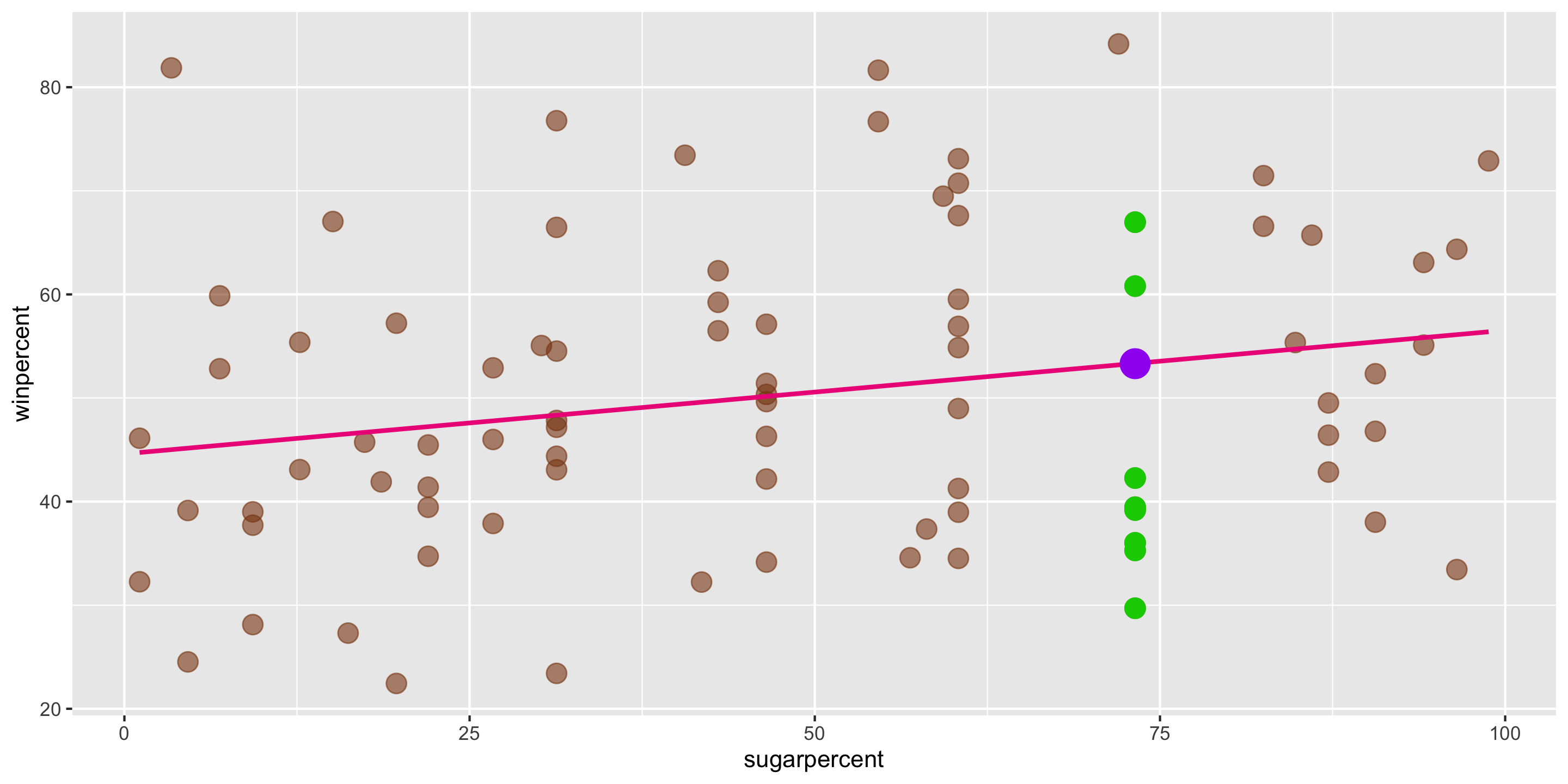 sugarpercent = 73. What does the model predict for winpercent?winpercents we see for candies with sugarpercent = 73.We can visualize the accuracy of a linear model using residual plots: