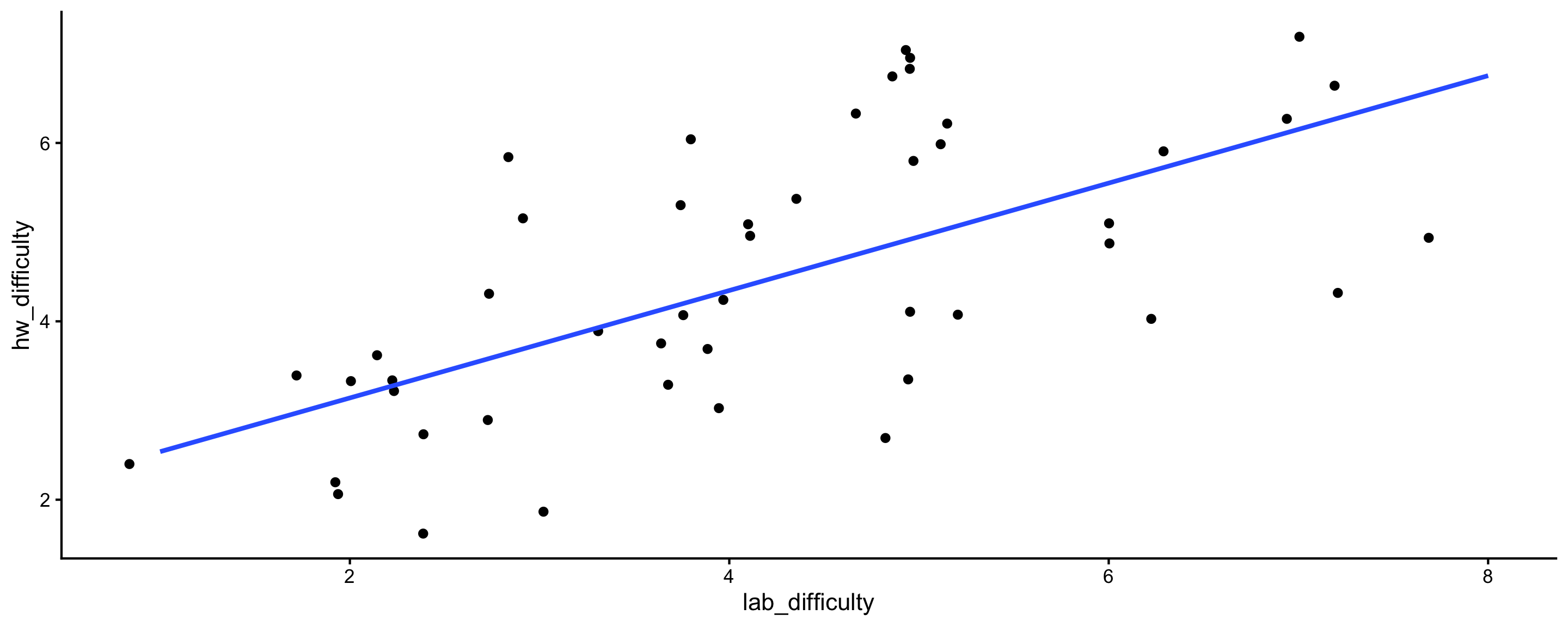 lab_difficulty?R to compute the least squares line and the values of \(\widehat{\beta}_0\) and \(\widehat{\beta}_1\).