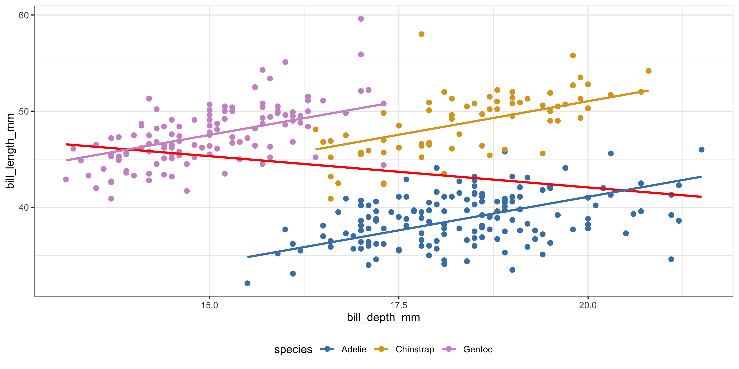 Explanatory variables: species and bill_depth_mm (equal slope)
