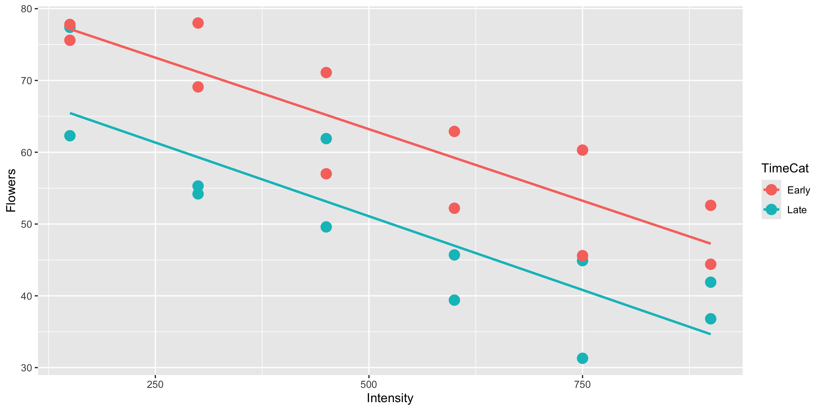 Meadowfoam is a plant that grows in the Pacific Northwest and is harvested for its seed oil. In a randomized experiment, researchers at Oregon State University looked at how two light-related factors influenced the number of flowers per meadowfoam plant, the primary measure of productivity for this plant. The two light measures were light intensity (in mmol/ \(m^2\) /sec) and the timing of onset of the light (early or late in terms of photo periodic floral induction).