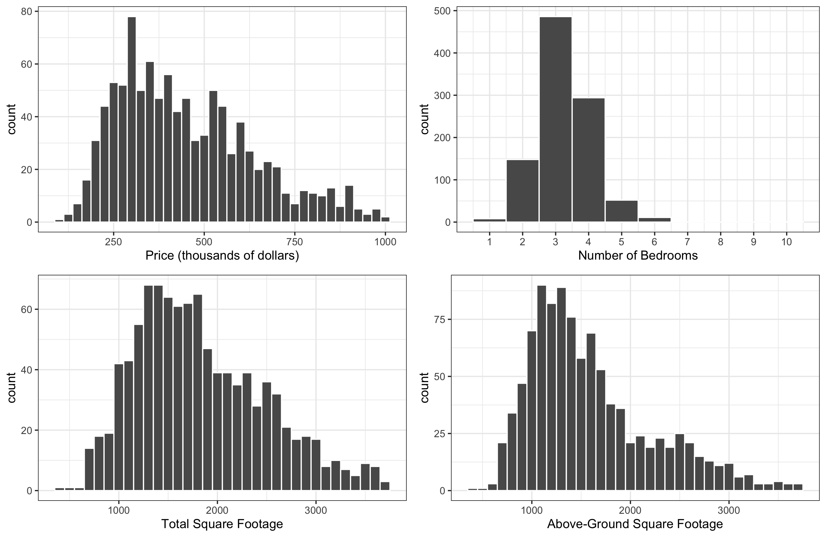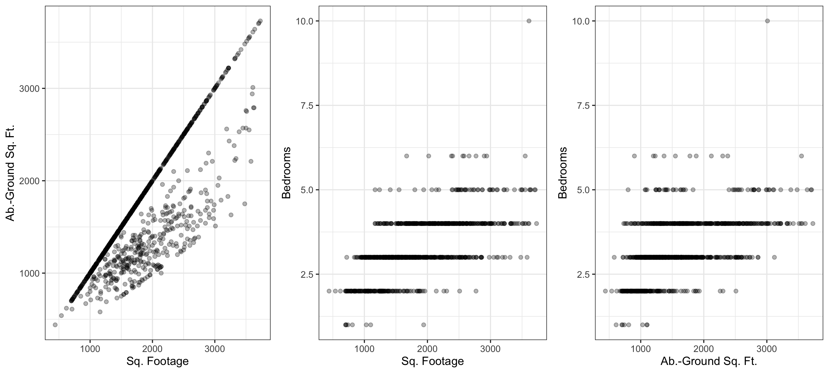 We’ll consider : Sale price (response); and square footage, above-ground square footage, and number of bedrooms (potential explanatory variables). Check out the exploratory plots below: