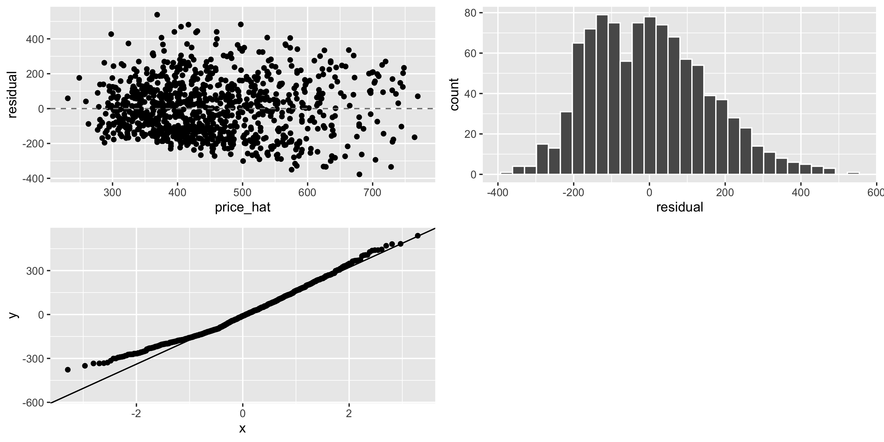 \[ \widehat{\text{price}} = 197 + 0.177*\text{sqrt_living} - 21.6*\text{bedrooms} \]