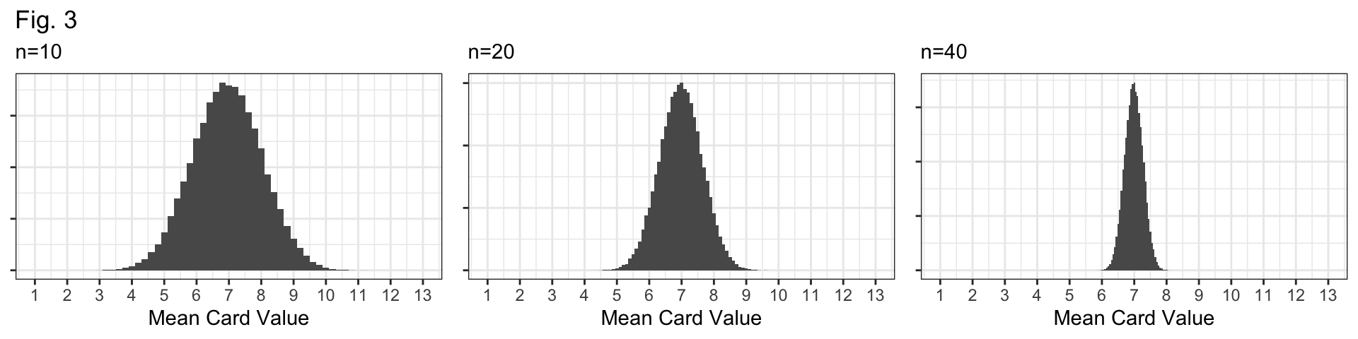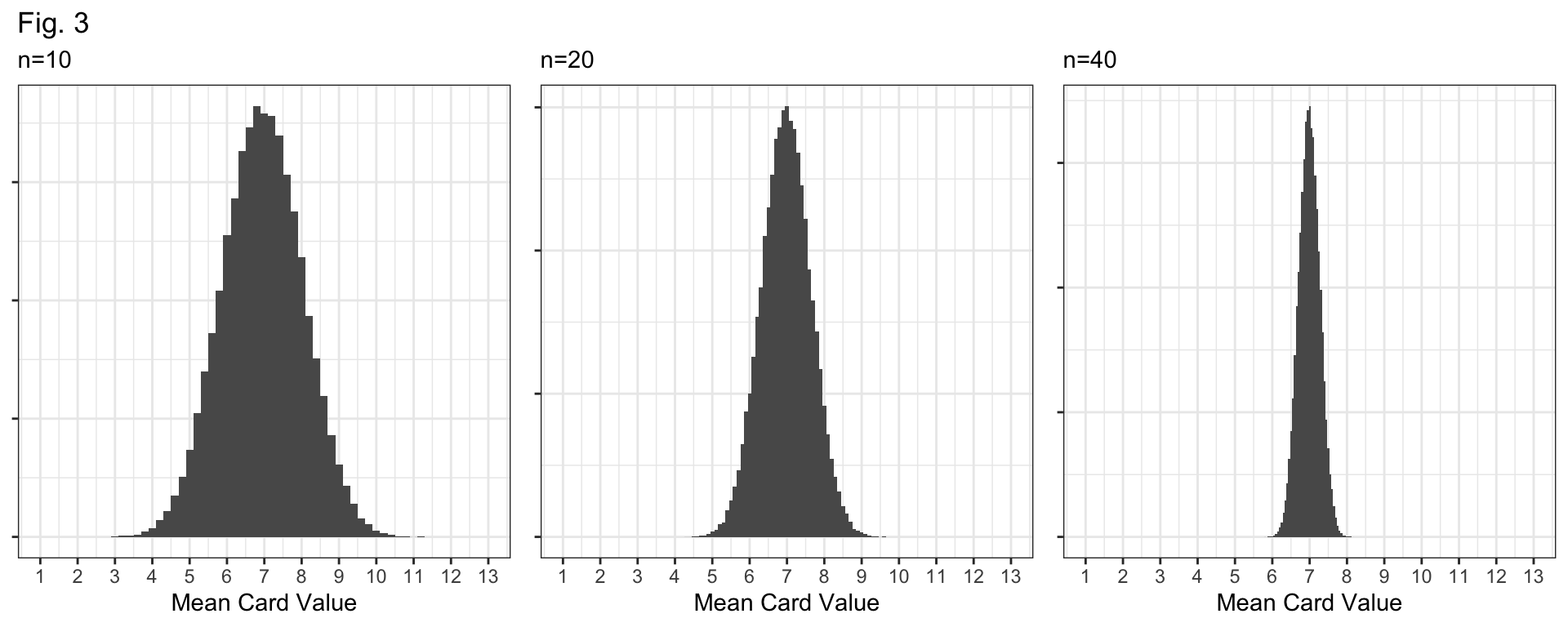 Q4: Figure 3 (below) displays sampling distributions for samples of size n=10, n=20, and n=40. How are they similar and how are they different? Why do larger samples have sampling distributions with less variability?