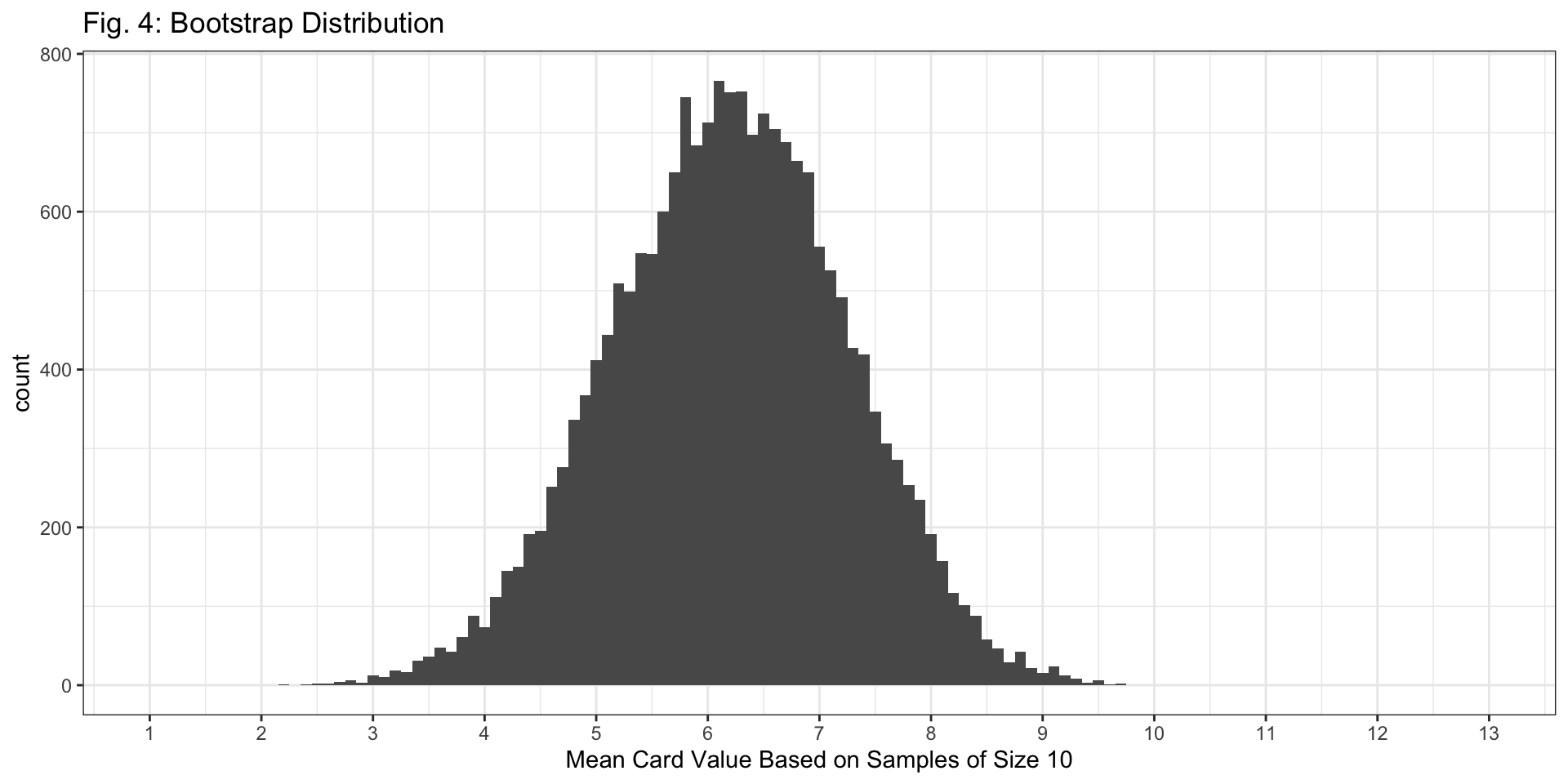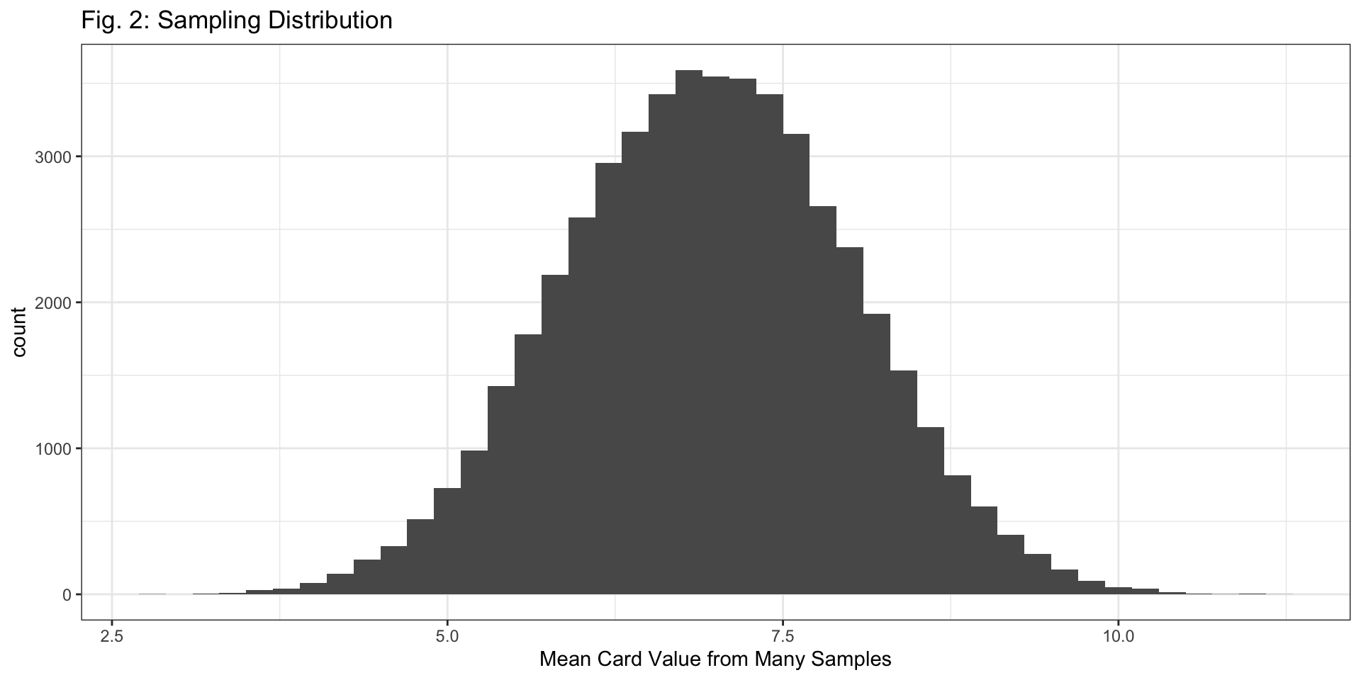 labs(x = "Mean Card Value Based on Samples of Size 10",
