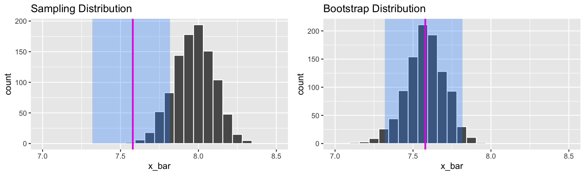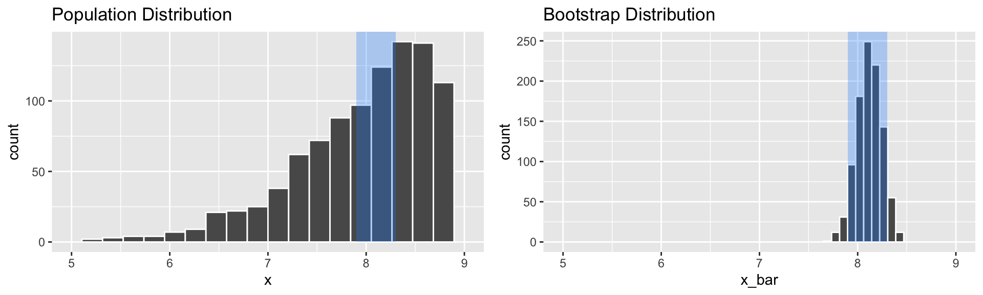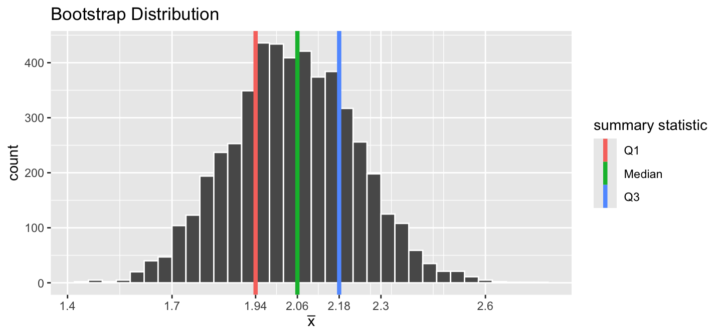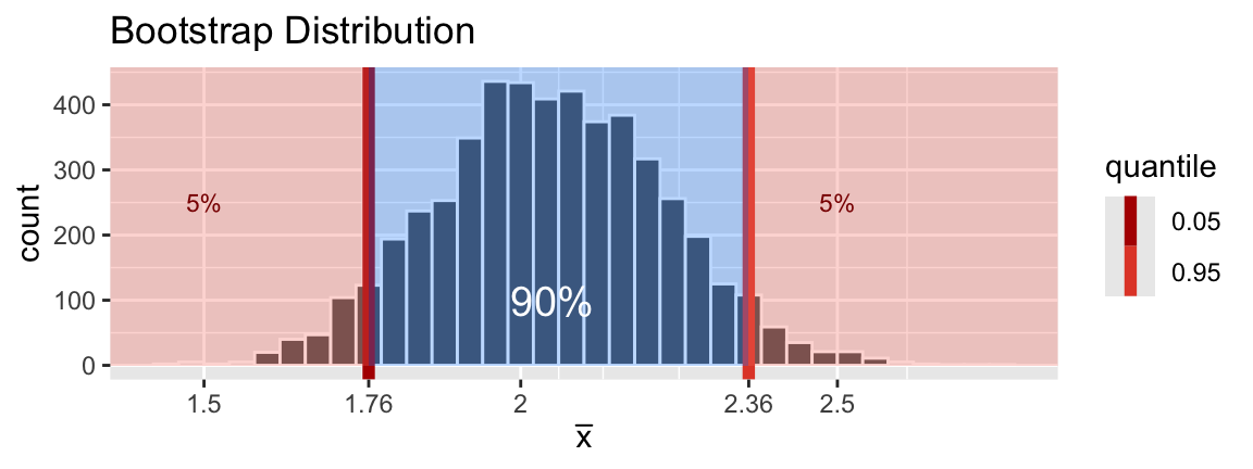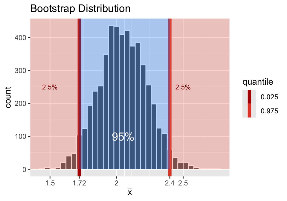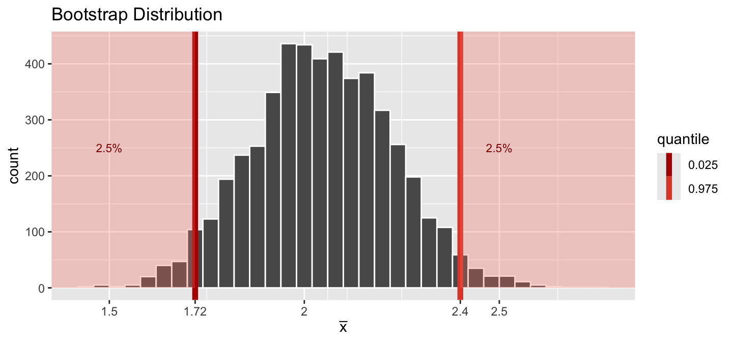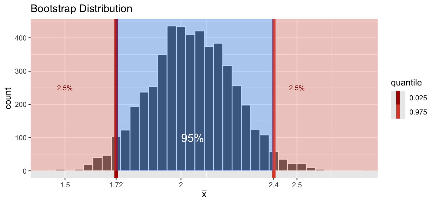 So using the .025 and .975 quantiles is roughly equivalent to forming a 95% CI as: \(\text{Statistic} \pm 2*\text{SE}\)!