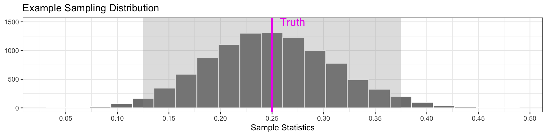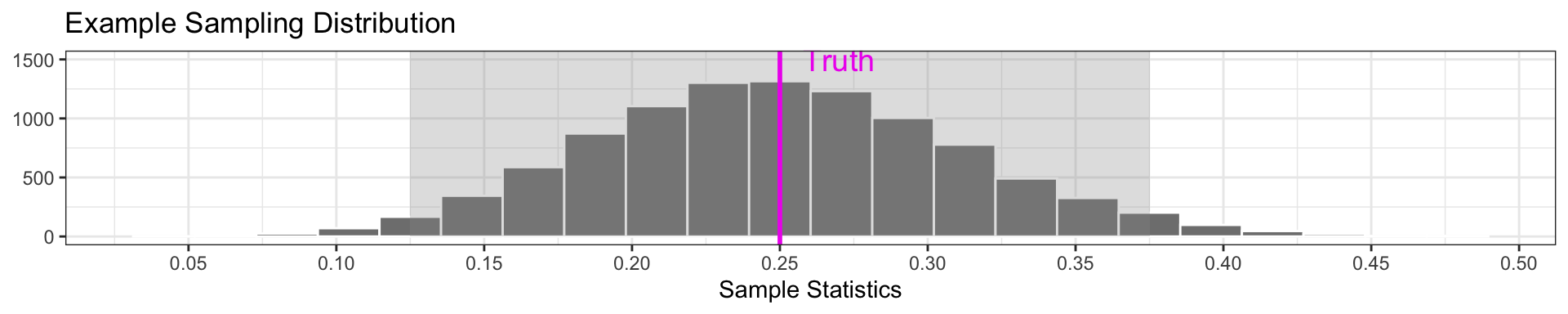 Implication: in the sampling distribution, 95% of sample statistics lie in the range: \[ \text{Parameter} \pm 2*\text{Standard Error} \] where the Standard Error is the standard deviation of the sampling distribution