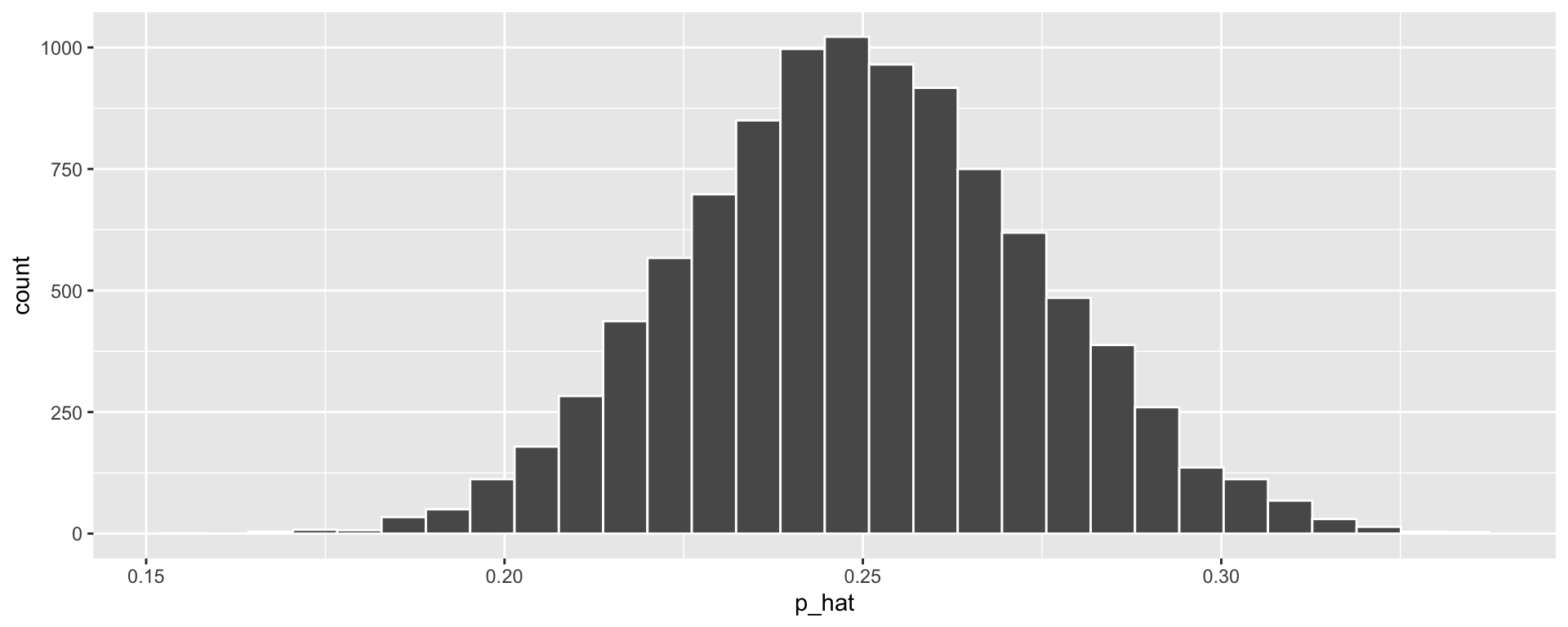 ggplot(null_stats, aes(x = p_hat)) + geom_histogram(color = "white")